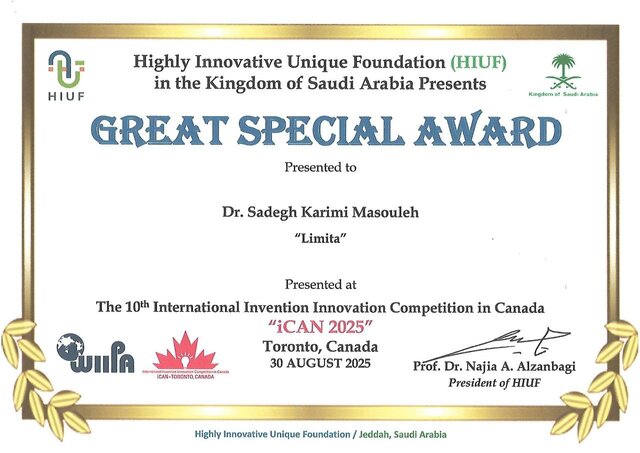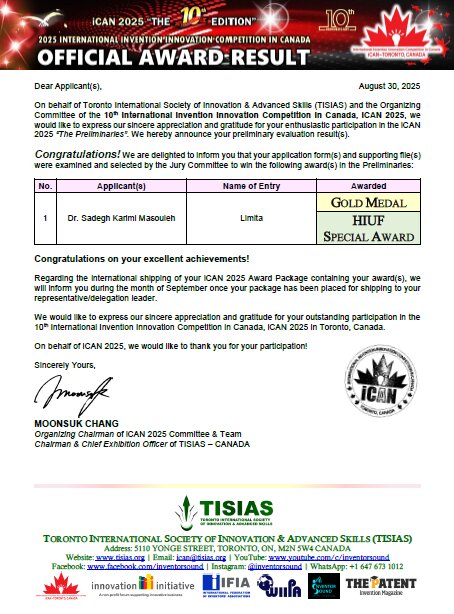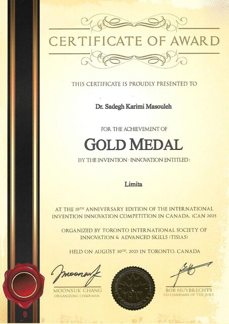 به گزارش خبرگزاری ایسنا، صادق کریمی ماسوله، عضو رسمی فدراسیون جهانی مخترعان که پیش از این توانسته بود با ارائه طرح روشنایی جاده بدون نیاز به هرگونه انرژی(اکوشاین) در مسابقات جهانی اراسموس هلند مدال طلا، جایزه ویژه مسابقات و بورسیه مقطع دکتری و همچنین در اختراع دیگر خود با عنوان «هلمولاک» طرح قفل شدن هوشمند کلاه ایمنی بر روی زین موتورسیکلت توانست مدال طلای مسابقات اختراعات امارات و لهستان و مدال نقره مسابقات سوئیس را کسب کند، در اختراع جدید دیگر با عنوان «لیمیتا» توانسته با کسب مدال طلا و جایزه ویژه دهمین دوره مسابقات جهانی اختراعات کانادا (۲۰۲۵) بر افتخارات خود بیافزاید.